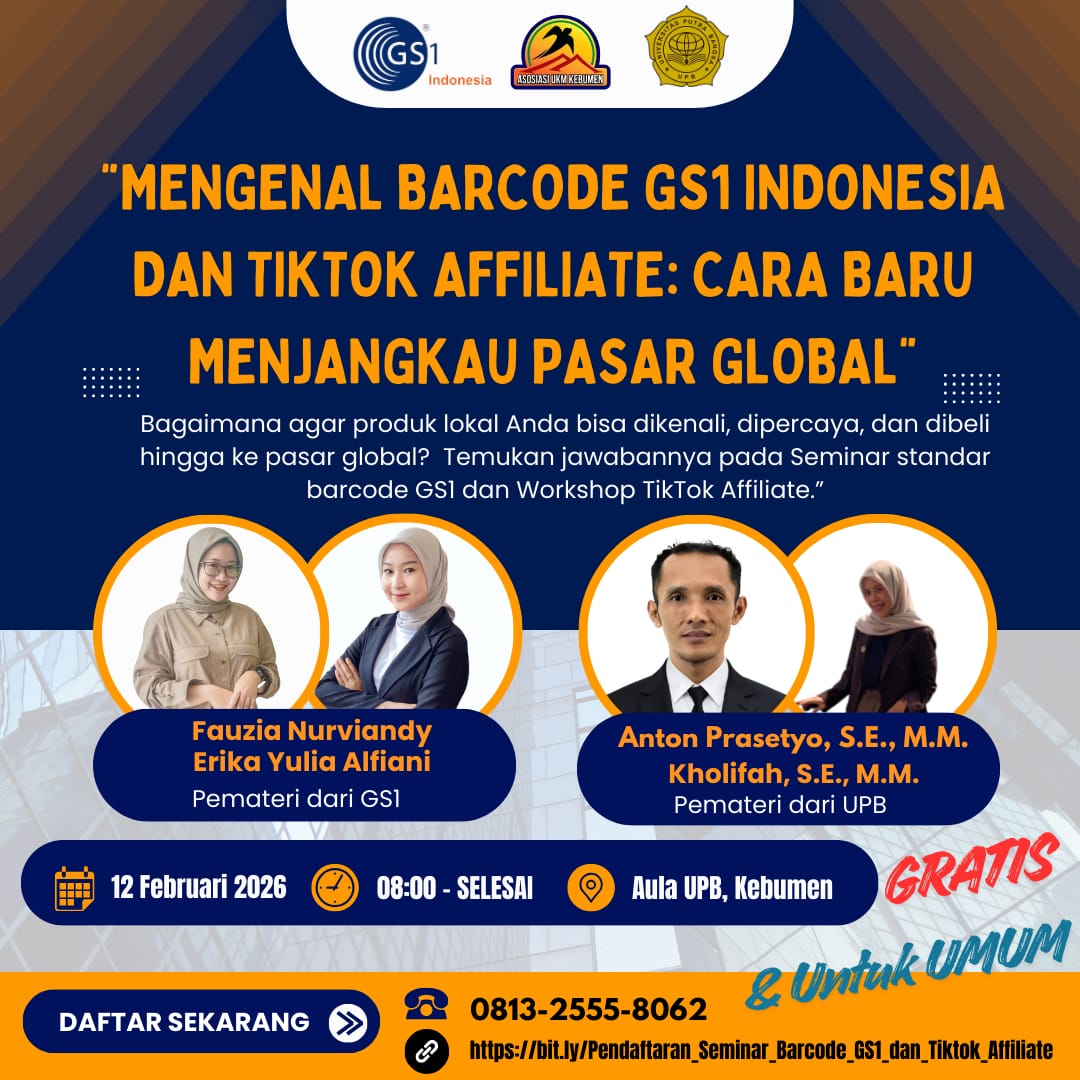 Universitas Putra Bangsa (UPB) bekerja sama dengan Asosiasi UKM Kabupaten Kebumen dan GS1 Indonesia menyelenggarakan workshop bertajuk “Mengenal Barcode GS1 Indonesia dan TikTok Affiliate: Cara Baru Menjangkau Pasar Global.” Kegiatan ini diikuti oleh pelaku UKM yang tergabung dalam Asosiasi UKM Kebumen serta peserta lainnya dari masyarakat umum. Workshop dilaksanakan pada Kamis, 12 Feb 2026 di Aula Universitas Putra Bangsa.